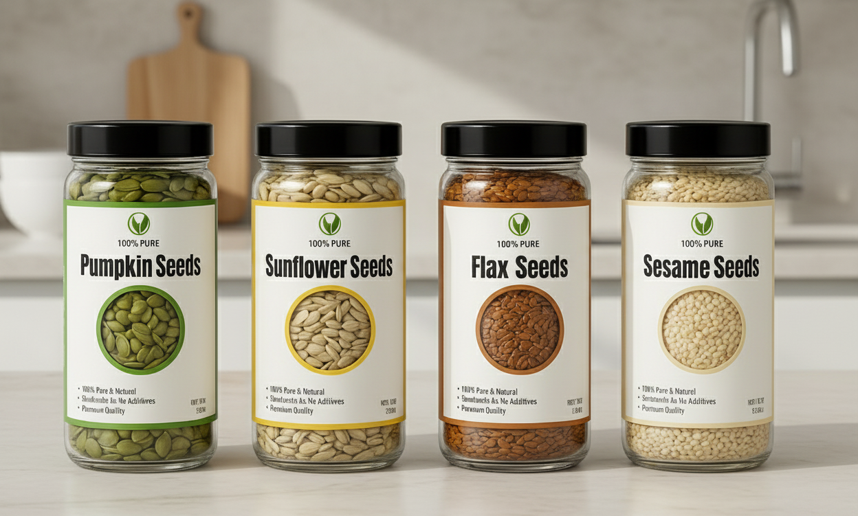 🌸 4-in-1 PCOS Seed Cycling Kit — Includes Flax Seeds, Pumpkin Seeds, Sesame Seeds, and Sunflower Seeds (150g each)